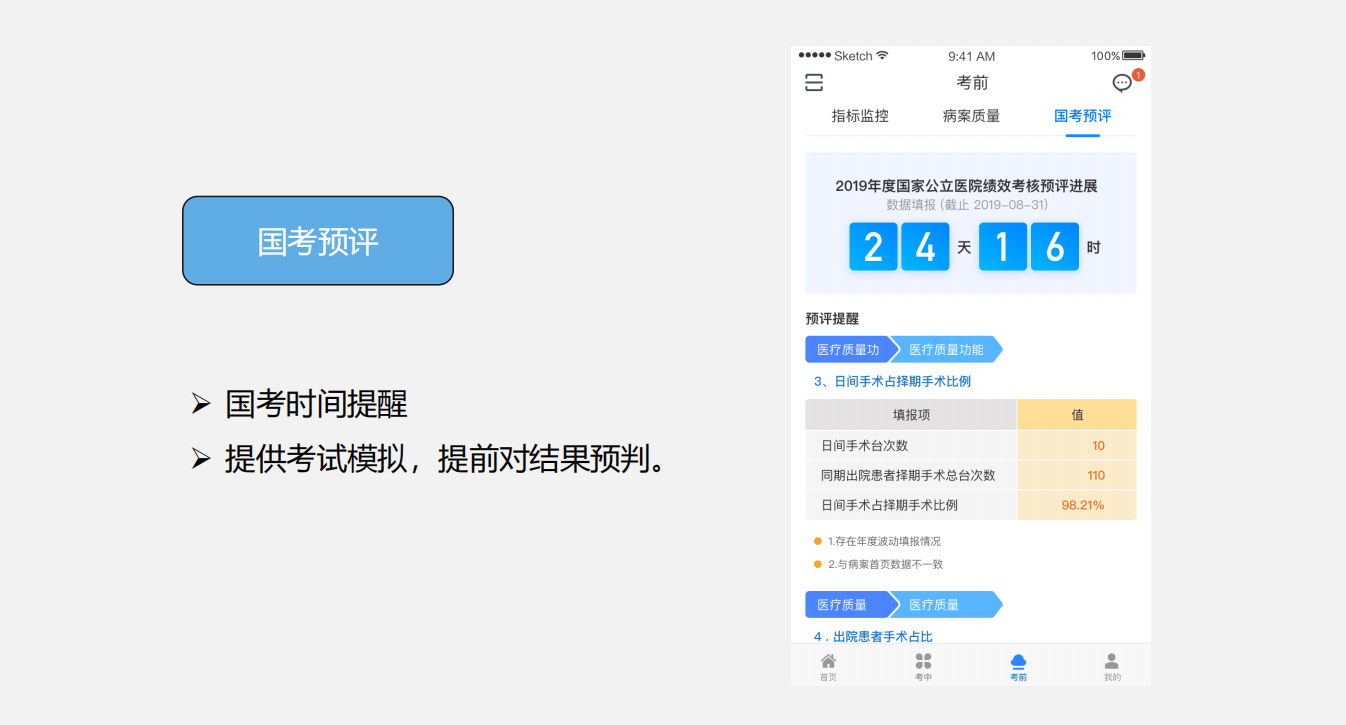 院端绩效APP、院端质控一体机、绩效提升咨询服务三大服务体系解决医院的信息沟通、考前准备、考中应对问题。