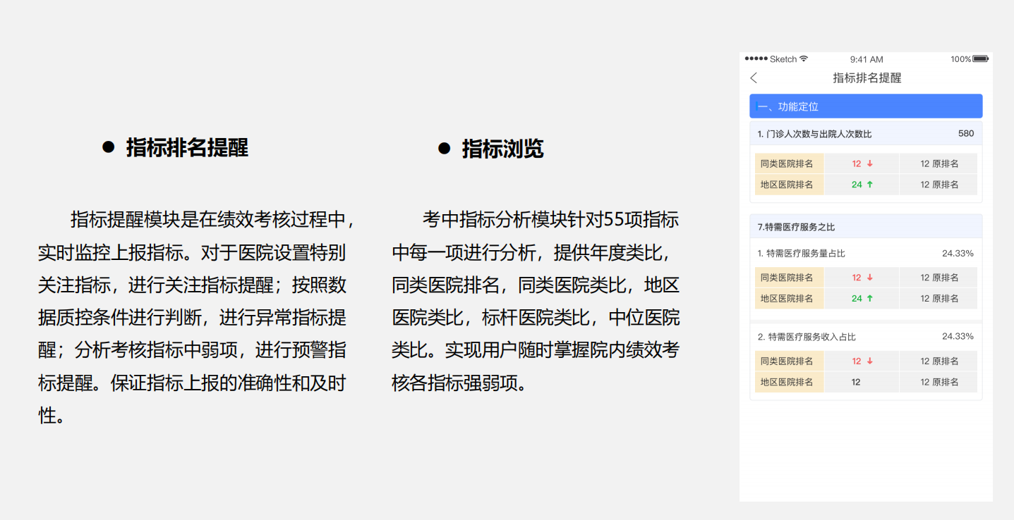 国家或省里定义的绩效指标进行深度解读,包含专家观点、定义、解释、计算公式、参考值范围等等。保证填报人员能进行准确理解指标释义,便于与业务科室沟通。随时随地获取指标相关服务,提高工作效率。